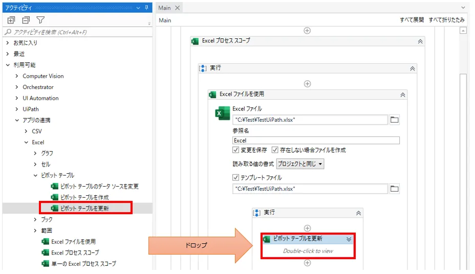 UiPath Excel(モダン) ピボット テーブルを更新 アクティビティ