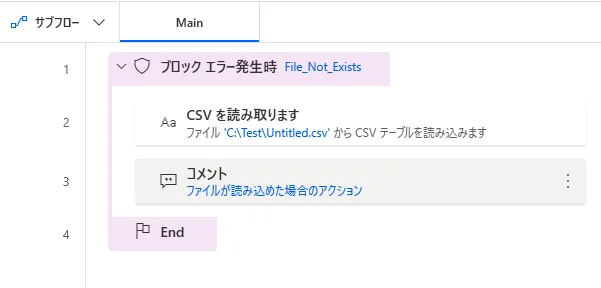 次のように設置するとファイルが存在しない場合は「CSVを読み取る」より後の処理を行いません。