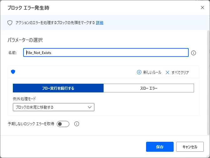 「ブロック エラー発生時」を設置して「フロー実行を続行する」を選択、