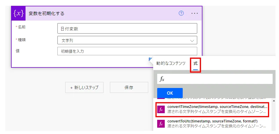 「式」タブ、convertTimeZoneをクリックすると関数名と()が数式欄にセットされます。
