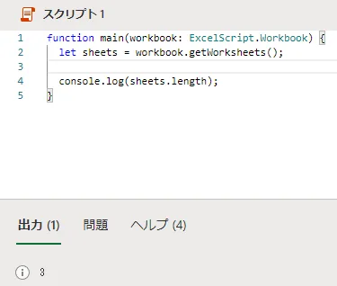 次のコード例では.lengthで件数(ブック内のシート)である3を出力しています。