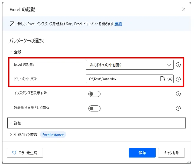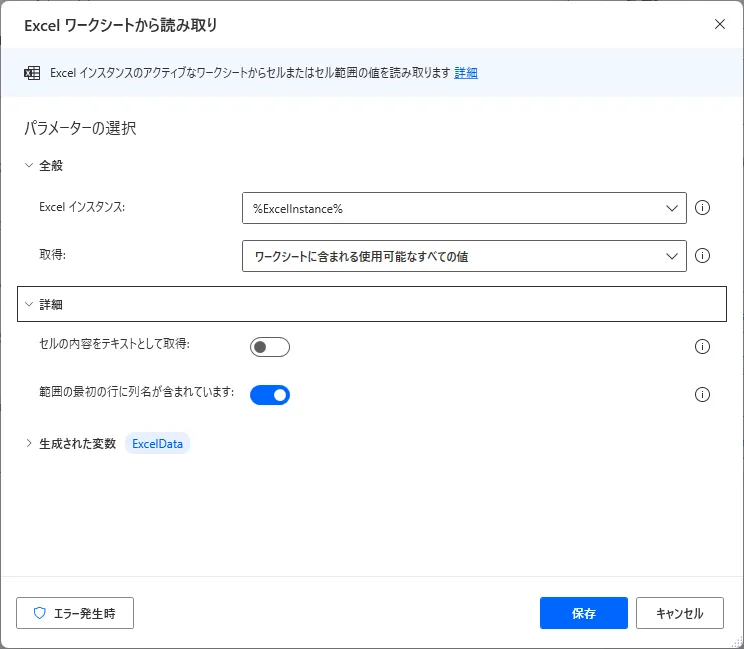 | Excel インスタンス | %ExcelInstance% | 「Excel の起動」の生成された変数 |