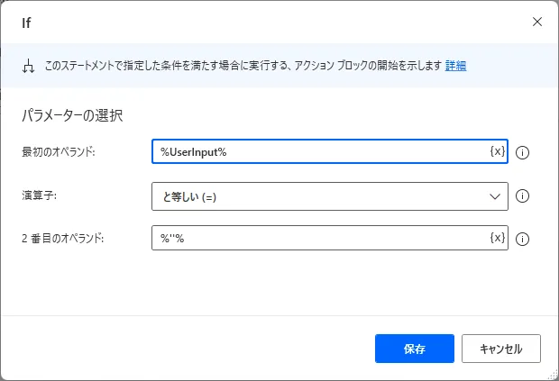 | 最初のオペランド | %UserInput% | 判定対象のテキスト |
