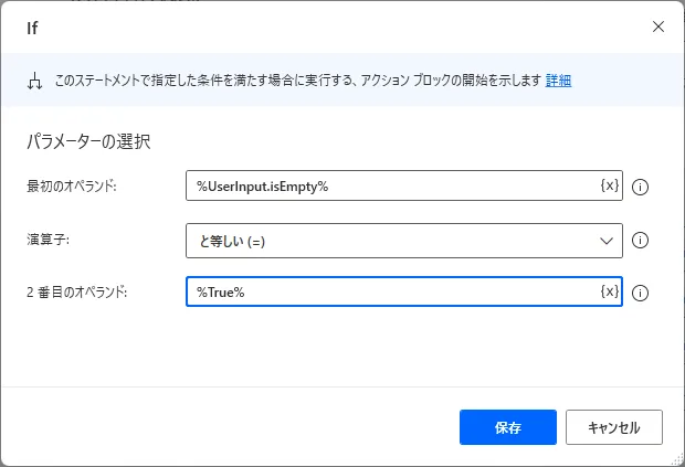 | 最初のオペランド | %UserInput.isEmpty% | 判定対象のテキスト |