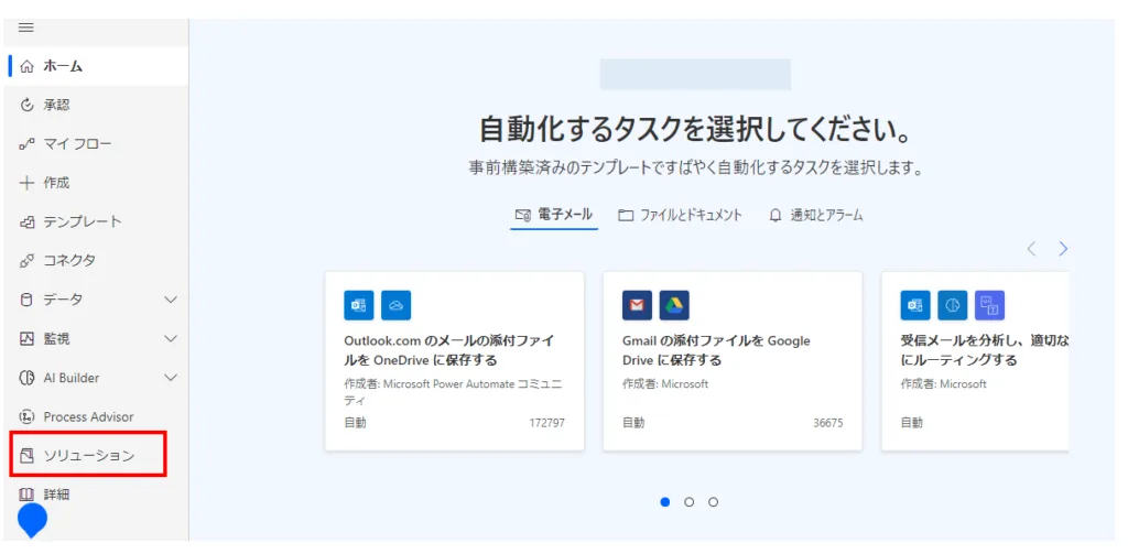 WebのPower Automate画面を開き「ソリューション」をクリックします。
