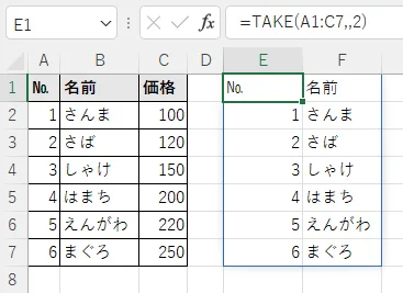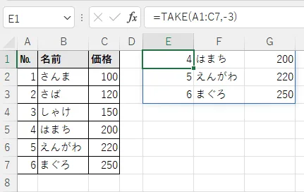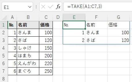 TAKE関数は結果としてセル範囲を返すスピル関数と組み合わせるケースの多い関数です。