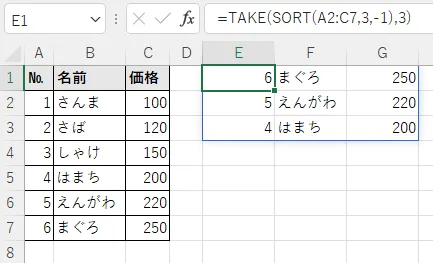 TAKE関数の1つ目の引数にSORT関数を指定すると