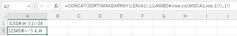 数式にはCONCAT、SORT、MAKEARRAY、LEN、LAMBDA、MIDを利用します。