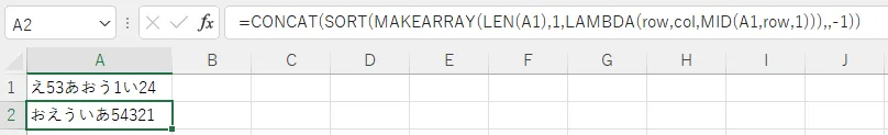 =CONCAT(SORT(MAKEARRAY(LEN(テキスト),1,LAMBDA(row,col,MID(テキスト,row,1))),,-1))