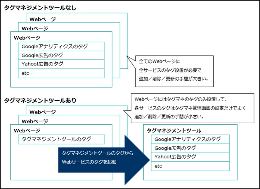 例えばWebページに複数の種類のWebサービスのタグを設置したい場合(Googleアナリティクス/Google広告/Yahoo!広告など)、それら全てのタグを設置する必要がありました。