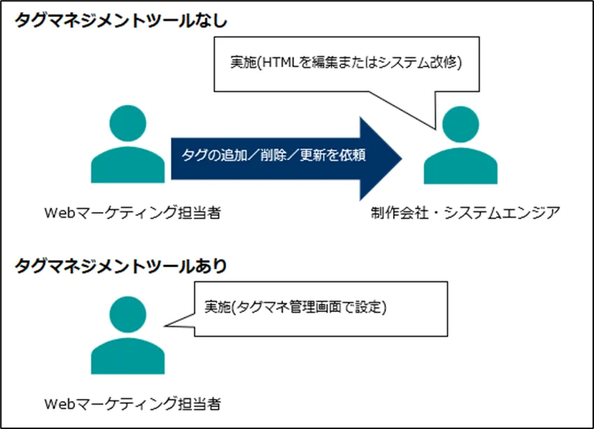 タグマネがない状態ではWebマーケティングの担当者が、Webページのシステム会社やシステム部門のエンジニアに設置依頼をする必要がありましたが、タグマネを導入するとWebマーケティング担当者が直接タグの管理を行えるようになるため、依頼するコスト(作業量や仕様の説明)をなくすことが可能でスピーディーな対応が可能になります。