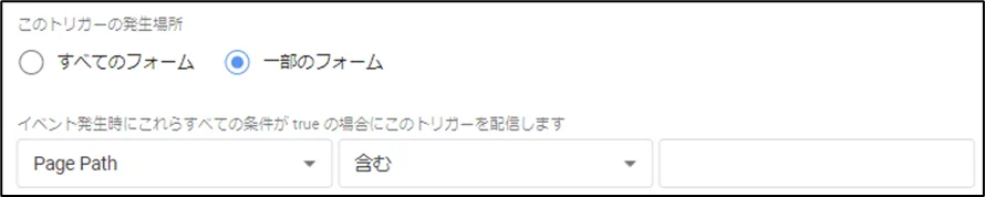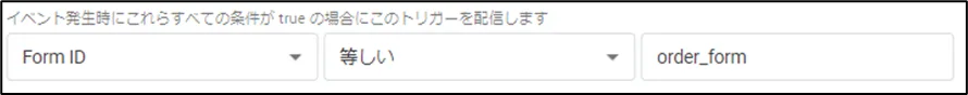 対象に「Form ID(HTMLのID属性)」、条件に条件に「等しい」「含む」「先頭が一致」「最後が一致」「等しくない」「含まない」「先頭が一致しない」「最後が一致しない」などを指定して、このトリガーが起動するフォームを指定します。