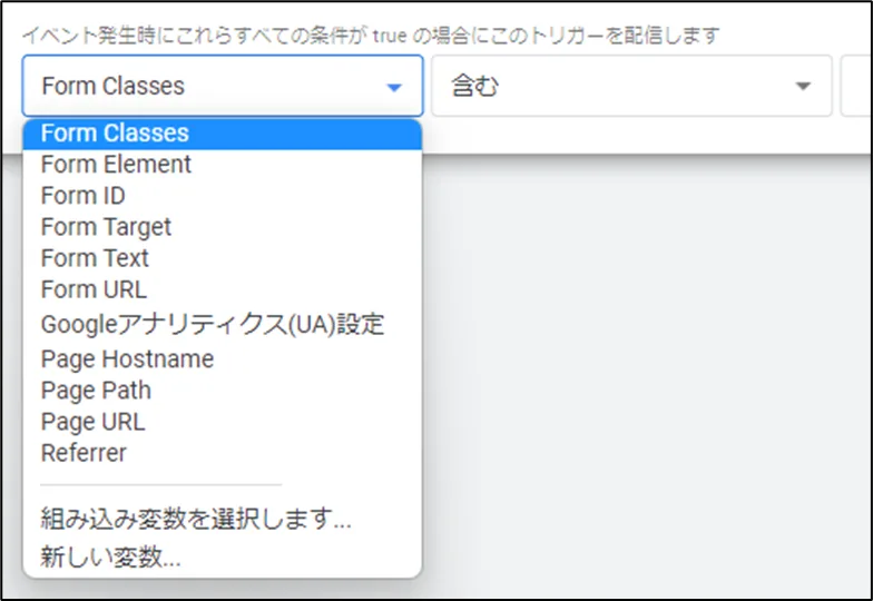 他には「組み込み変数を選択します」を選択して表示される「Form ID」や「Form Element」を利用するとフォームを条件にすることが可能です。