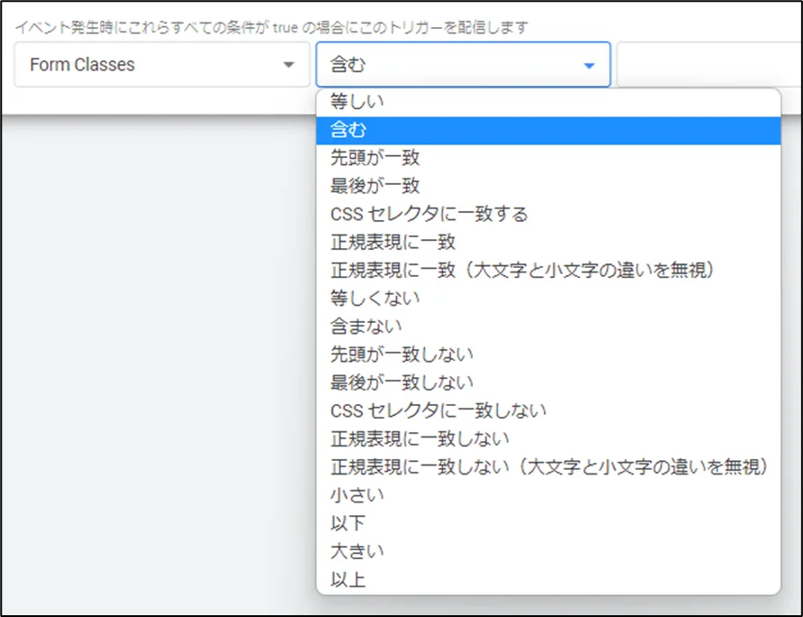 フォームでは主にサイトURLやフォームのIDを対象にするため「等しい」「含む」「先頭が一致」「最後が一致」「等しくない」「含まない」「先頭が一致しない」「最後が一致しない」「CSSセレクタに一致する」「CSSセレクタに一致しない」を使います。正規表現を利用すると詳細な指定が可能ですが、前述の条件で満たせることが多いため、正規表現まで必要なことは少ないです。「小さい」「以下」「大きい」「以上」は対象を数値の変数にしている場合に利用して、商品金額が●●以上のような条件指定に利用しますがレアケースです。