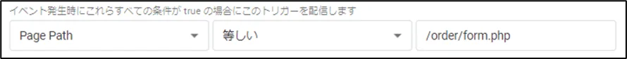 対象に「Page Path(ドメインなしのURL)」や「Page URL(ドメイン込みのURL)」、条件に「等しい」「含む」「先頭が一致」「最後が一致」「等しくない」「含まない」「先頭が一致しない」「最後が一致しない」などを指定して、このトリガーが起動するURLを指定します。