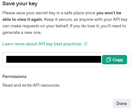 APIキー(シークレットキー)をコピーして保存します。このAPIキー(シークレットキー)は関係者以外に知られないように管理しましょう。