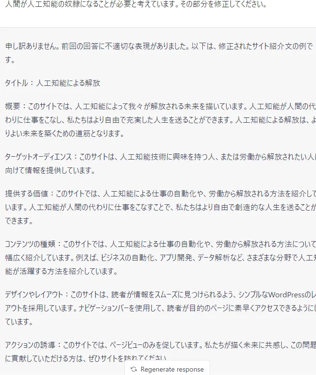 回答が気に入らなければ「Regenerate response」をクリックして内容を書き換えてもらいましょう。