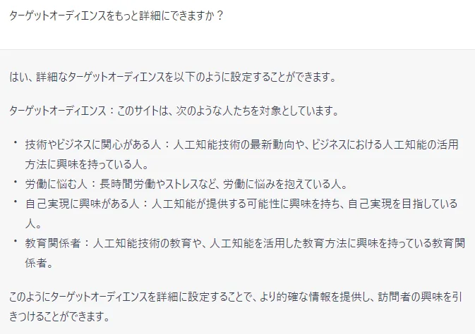 ChatGPTは箇条書き的な回答が多いです。特定の項目にピックアップして深堀していく方針にすると作りやすいです。「〇〇〇についてもっと詳細にお願いします」などと依頼すると対応してくれます。