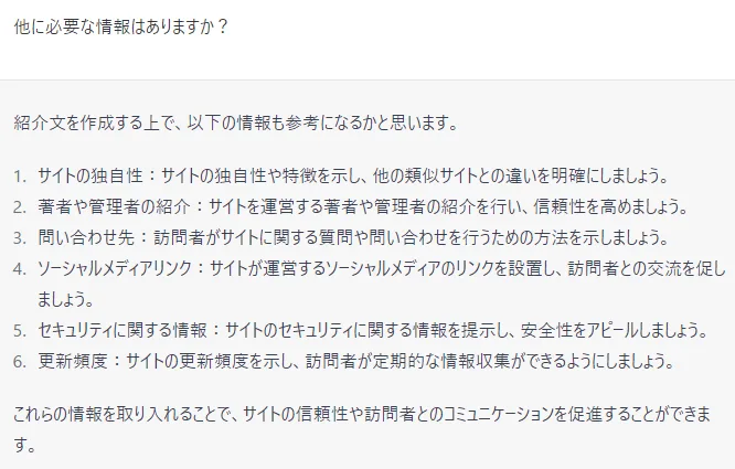 提示された形式に合わせて情報を入力します。フォーマットは違っても、ChatGPTが理解できれば対応してくれます。(実際にはもっと詳細な情報を与えた方がよいです)