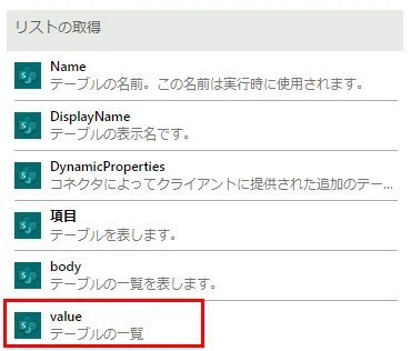 「リストの取得」アクションの動的なコンテンツのvalueを指定します。