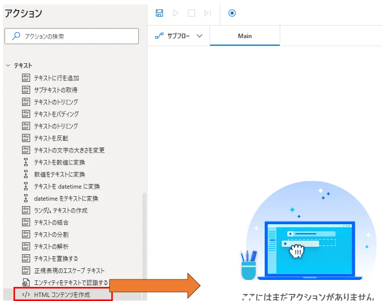 「アクション」の「テキスト」より、「HTML コンテンツを作成」をドラッグします。