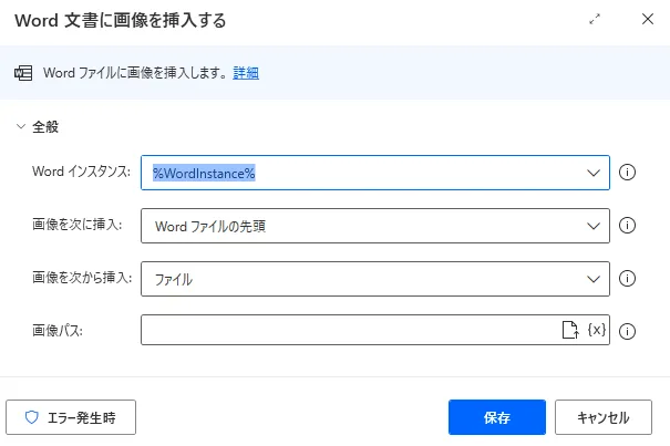 Power Automate Desktop 「Word 文書に画像を挿入する」アクション